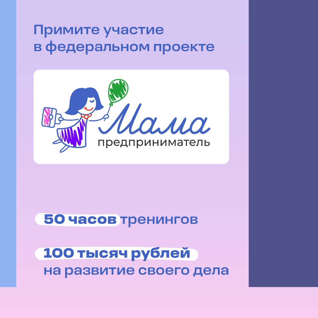 «Мама-предприниматель» — федеральная грантовая программа для женщин, планирующих начать свой бизнес. Участницы смогут прокачать собственную идею или развить уже существующий проект, узнать о мерах господдержки и войти в бизнес-среду.